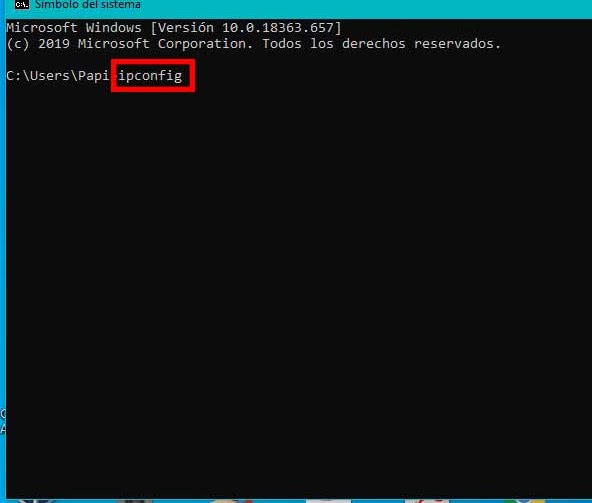 Ahora escribe el comando ipconfig dentro de la consola, presiona enter y esta te devolverá una gran cantidad de datos. Busca entre ellos uno en el que ponga Puerta de enlace predeterminada, que será el que te diga tu dirección IP. Toma nota de ella.